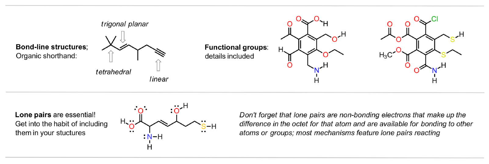 It is important to be able to identify functional groups in organic molecules since they are the entities that have function and undergo chemical change. There are around 15 important functions that must be memorized over the two semesters, many of them being used later in Biochemistry and Polymer Chemistry. Examples of groups from the first semester are given below and both semesters are summarized in the video.