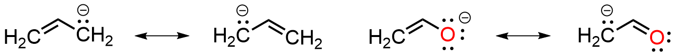 There are really only three patterns involved with delocalizing a pair of electrons; here we will call them Pattern A, Pattern B, and Pattern C. To recognize resonance in a charged molecule it must contain an electron source and an electron sink; the former is either a non-bonded lone pair or a pi bond, the latter is usually an atom capable of accepting a lone pair, for example a second-row element or an empty p orbital. Typical examples are shown below for allyl-type anions with the electron source being a lone pair and the sink being the terminal atom of the pi bond. The double-headed arrows may be used to describe the spreading of electron density in each case. This will be referred to as Pattern A.