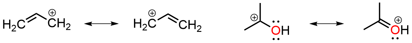 For allyl cation systems we are looking at an electron deficiency and not an electron excess as with the above anionic molecules. Here (on the left) the sink atom, usually carbon, has lost a pair of electrons from its octet, however conjugation to a pi bond allows for stabilization through delocalization. Again, we are looking at a 3-atom allyl-type system but the direction of electron spreading is reversed compared to the anions. This is Pattern B. In the example on the right, the carbocation is directly attached to a heteroatom that has non-bonding electrons (a lone pair) available to share. In such cases only two atoms are involved in resonance, however the principle of the electron donor and electron sink still applies. This is referred to as Pattern C.