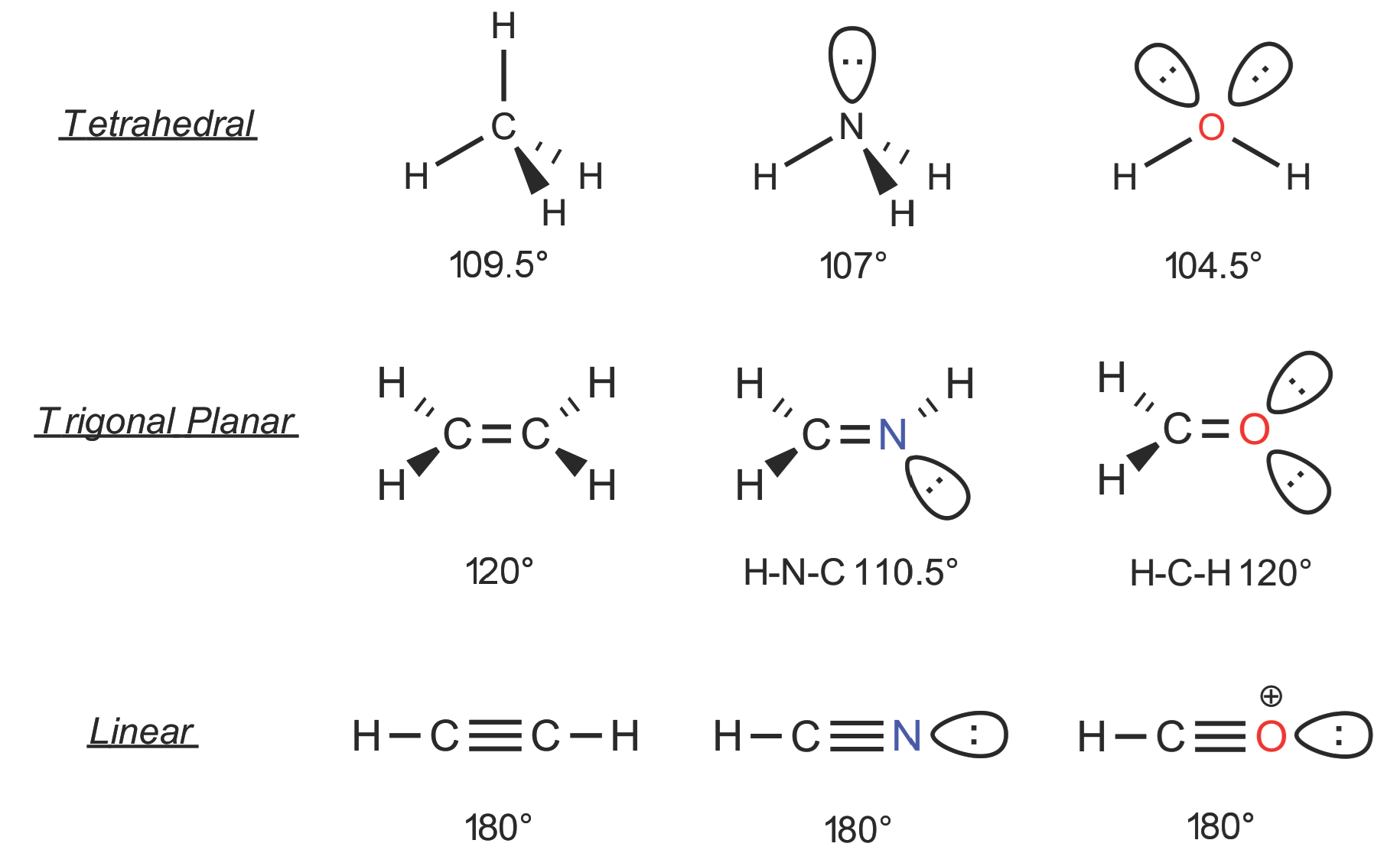 There are three important geometries displayed by carbon, and then nitrogen and oxygen with small deviations. When C is connected to other atoms by only single bonds it is said to be sp3 hydridized with a tetrahedral geometry. This is exemplied by the molecule ethane below in which all H-C-C-H bond angles will be close to 109 degrees. For nitrogen, which has a lone pair in place of one bond, the angle deviates away from 109 since the lone pair repels more; likewise for oxygen with two lone pairs. The shape around those atoms may be described as distorted tetrahedral (or trigonal pyramidal for N and bent for O).